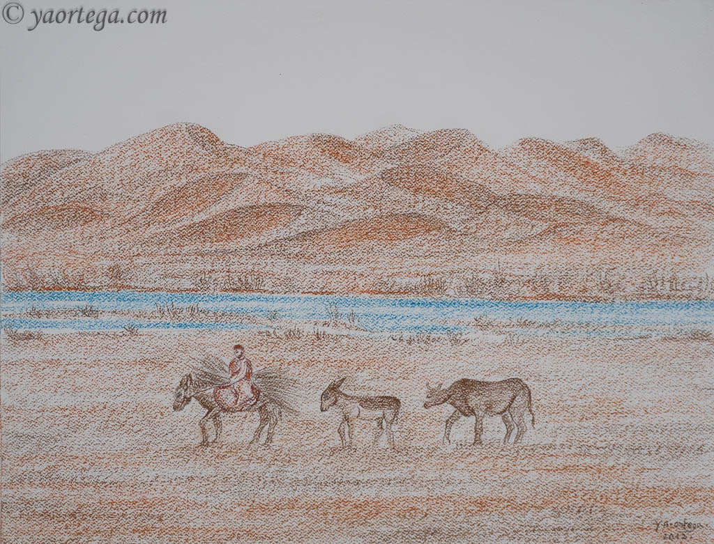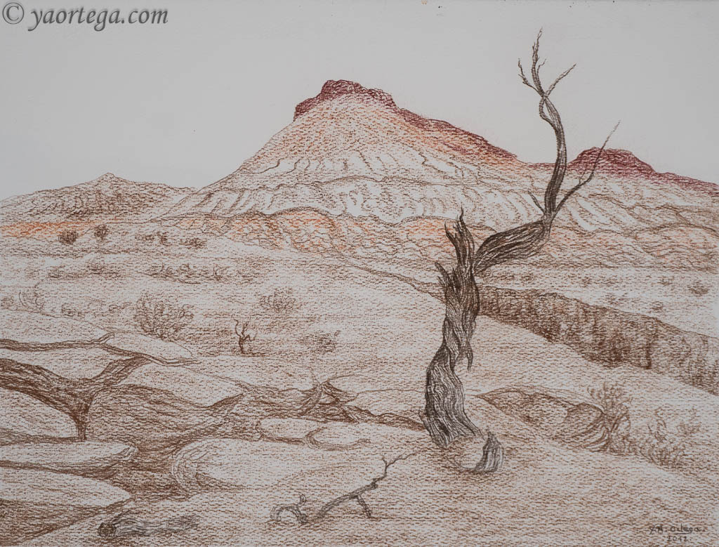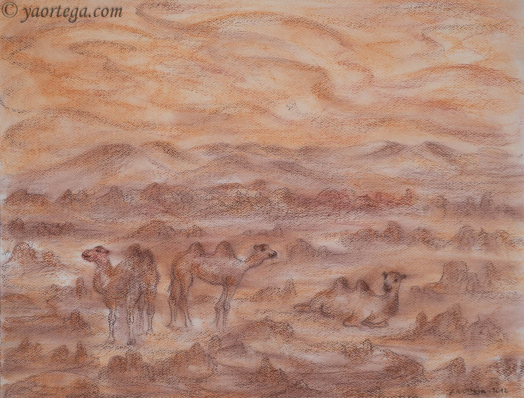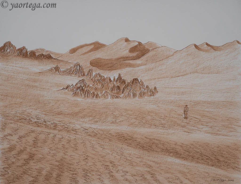 L’artiste nous offre ici 41 tableaux de déserts réalisés avec des pastels secs. En suivant différents thèmes qui ont pour point de départ la remarque de Nietzsche « Le désert croît. Malheur à celui qui recèle en lui un désert ! » (Ainsi parlait Zarathoustra).